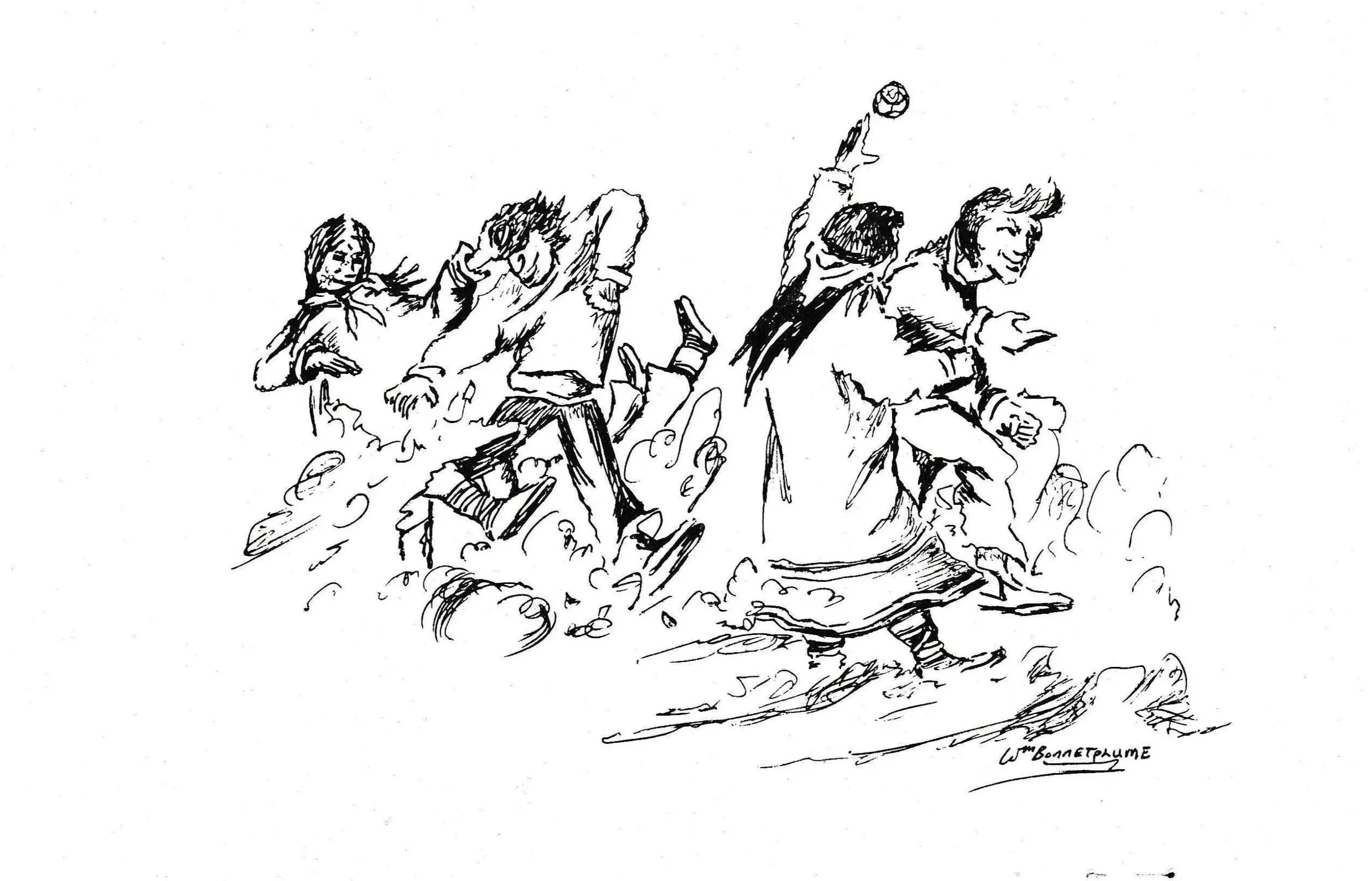 The game is played, usually with the men and boys against the women and girls. There were no rules except that the ball had to be kept in the air by hitting it with one hand. It could not be caught or held. The obiect of the game is for the men to keep the ball away from the women.